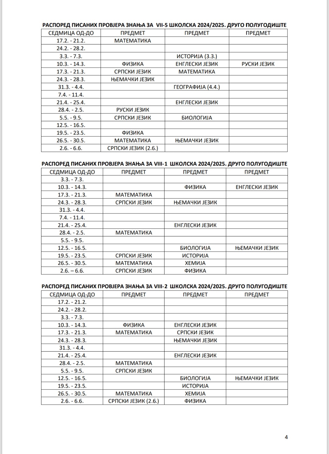 РАСПОРЕД ПИСАНИХ ПРОВЈЕРА У ДРУГОМ ПОЛУГОДИШТУ