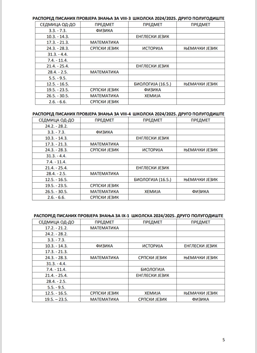 РАСПОРЕД ПИСАНИХ ПРОВЈЕРА У ДРУГОМ ПОЛУГОДИШТУ